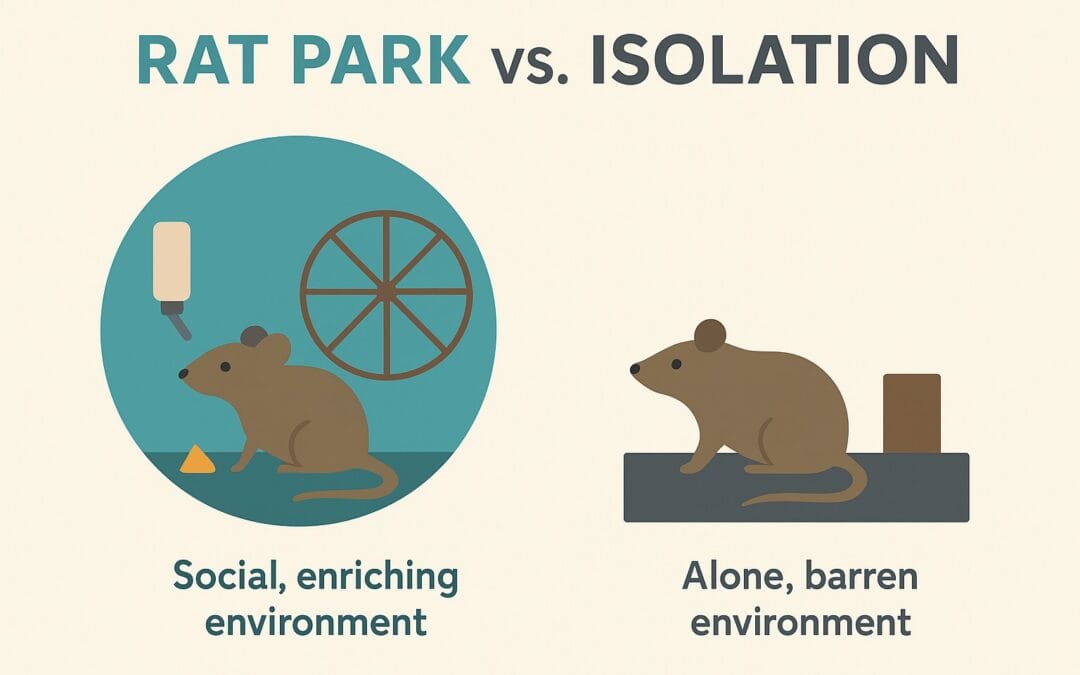 When researchers ran the experiment again — this time placing the rats in what they called "rat park," with community, connection, and the things that make life feel worth living — none of them chose the cocaine.